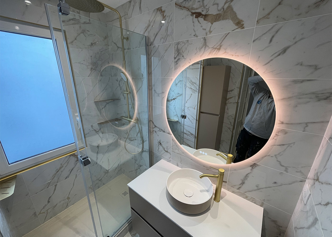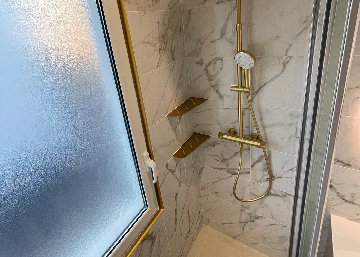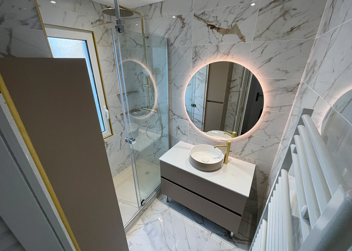 Le carrelage effet marbre confère une touche élégante et intemporelle, sublimée par une robinetterie en laiton. Un meuble vasque accompagné de rangements sur mesure et un miroir LED viennent compléter cet espace raffiné, pensé dans les moindres détails.