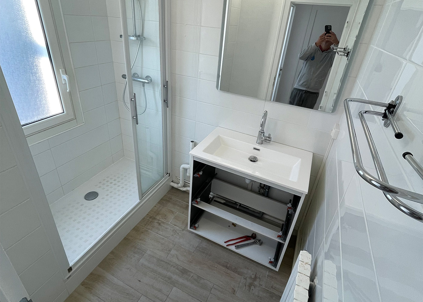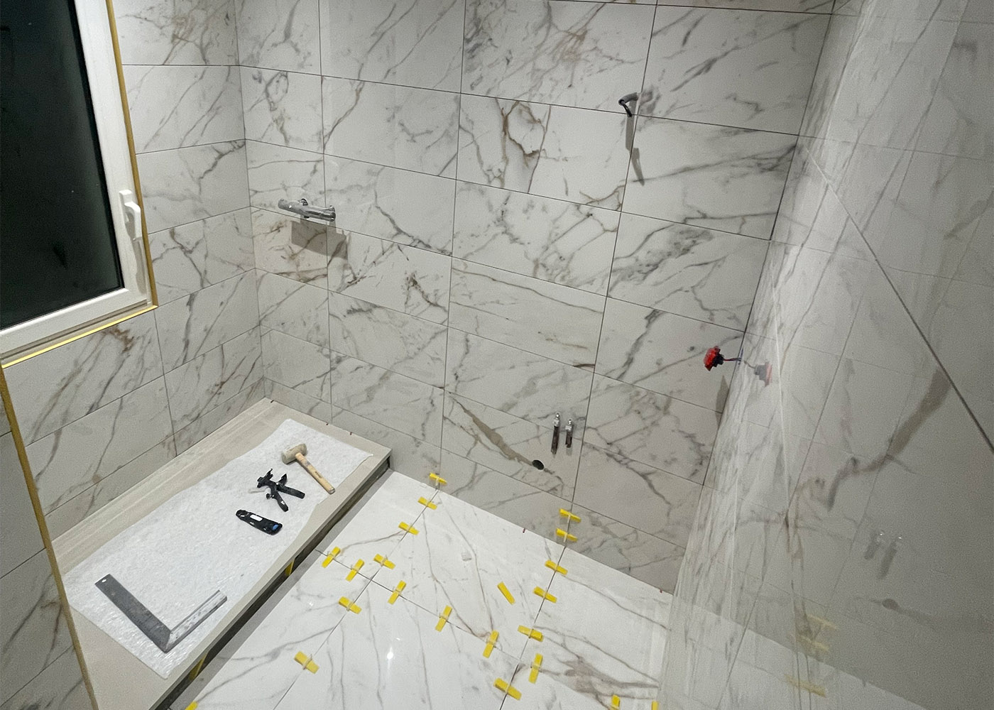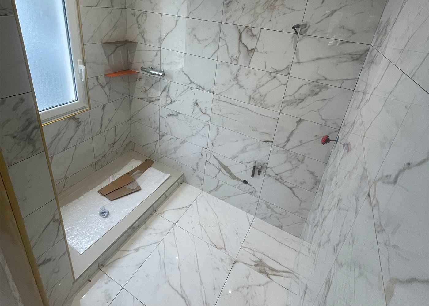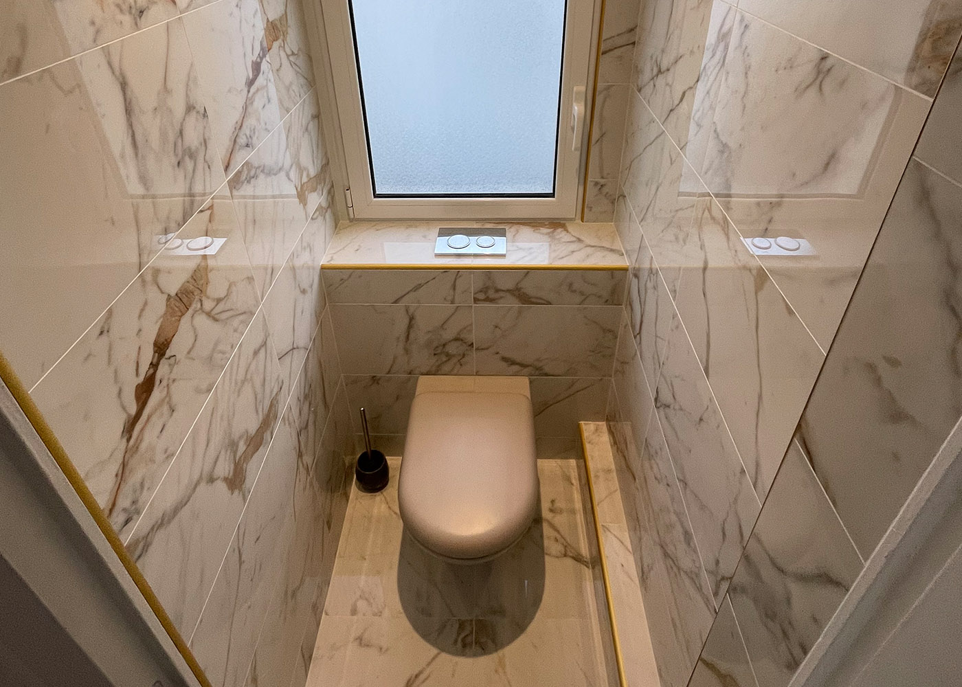 Le carrelage effet marbre confère une touche élégante et intemporelle, sublimée par une robinetterie en laiton. Un meuble vasque accompagné de rangements sur mesure et un miroir LED viennent compléter cet espace raffiné, pensé dans les moindres détails.