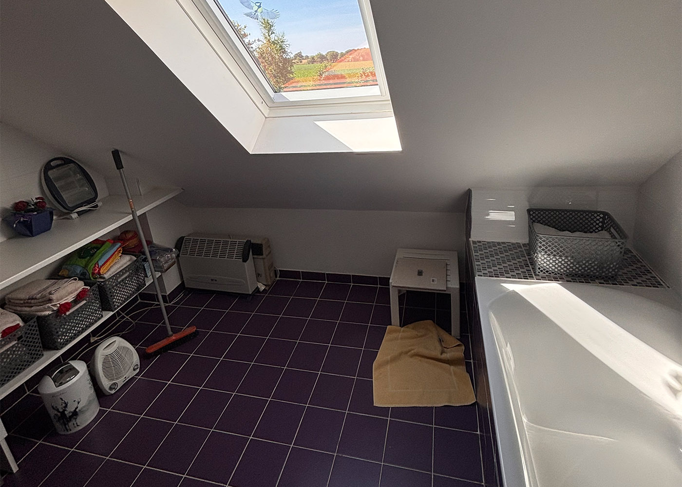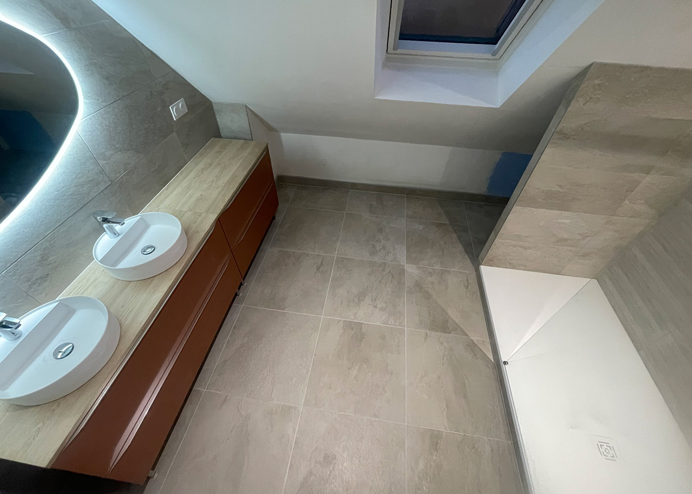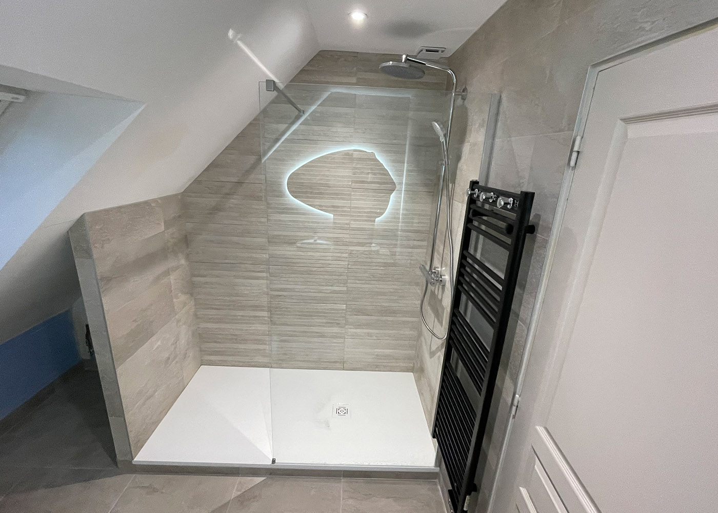 La baignoire existante a été remplacée par une douche à l’italienne, parfaitement intégrée sous la pente. Le choix d’un carrelage grand format, d’un miroir LED et d’un sèche-serviettes moderne apporte une atmosphère élégante et contemporaine tout en maximisant le confort et la luminosité.